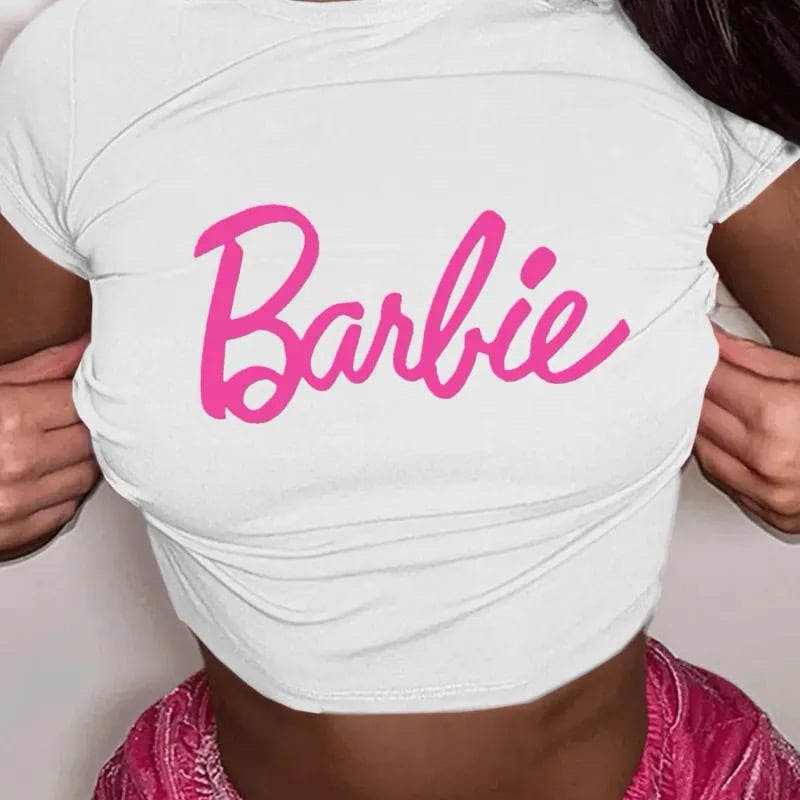 Her Barbie is the ultimate soft statement. Featuring a crisp white cropped fit with bold pink graphic writing, this top blends playful energy with confident attitude.