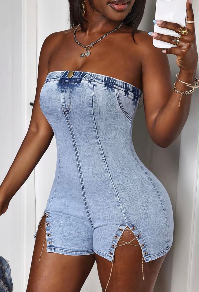 The She’s Sweet denim romper features a cropped top design with a cinched waist that snatches your shape effortlessly. Finished with edgy side splits and chain detailing, this piece brings the perfect mix of soft and street.