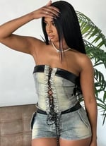 A little retro, a little bold, and all confidence. The She’s Vintage two-piece denim set features a shirred strapless top with edgy leather trim paired with matching denim shorts for that effortless Y2K vibe. It’s playful, stylish, and made for the woman who knows how to mix classic denim with modern attitude.